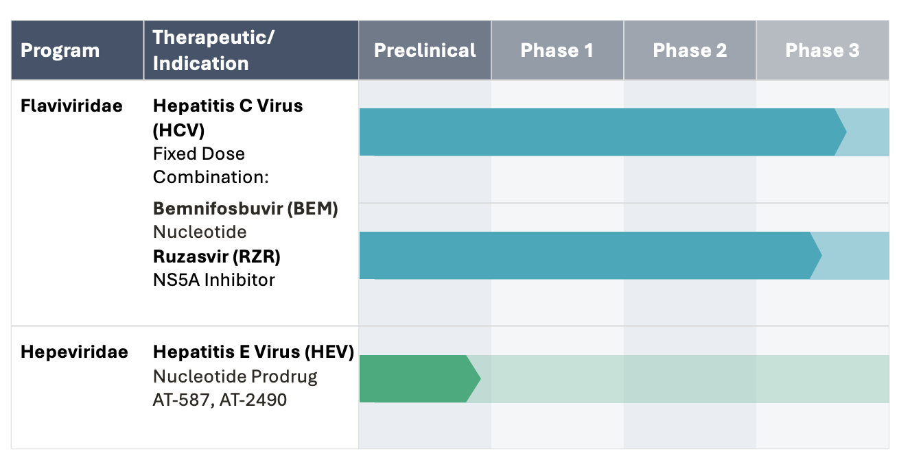 Leveraging our deep understanding of antiviral drug development, nucleos(t)ide chemistry, biology, biochemistry and virology, we are developing novel product candidates to treat single stranded ribonucleic acid, or ssRNA, viruses, which are a prevalent cause of serious viral diseases. To address a variety of infections caused by RNA viruses, we are advancing product candidates that are designed to directly inhibit viral replication by blocking the synthesis of viral RNA. Product candidate characteristics include: enhanced antiviral activity and selectivity, well tolerated profiles, convenience of once or twice daily oral administration and efficient, scaleable and reproducible manufacturing, as well as long shelf life for potential stockpiling.